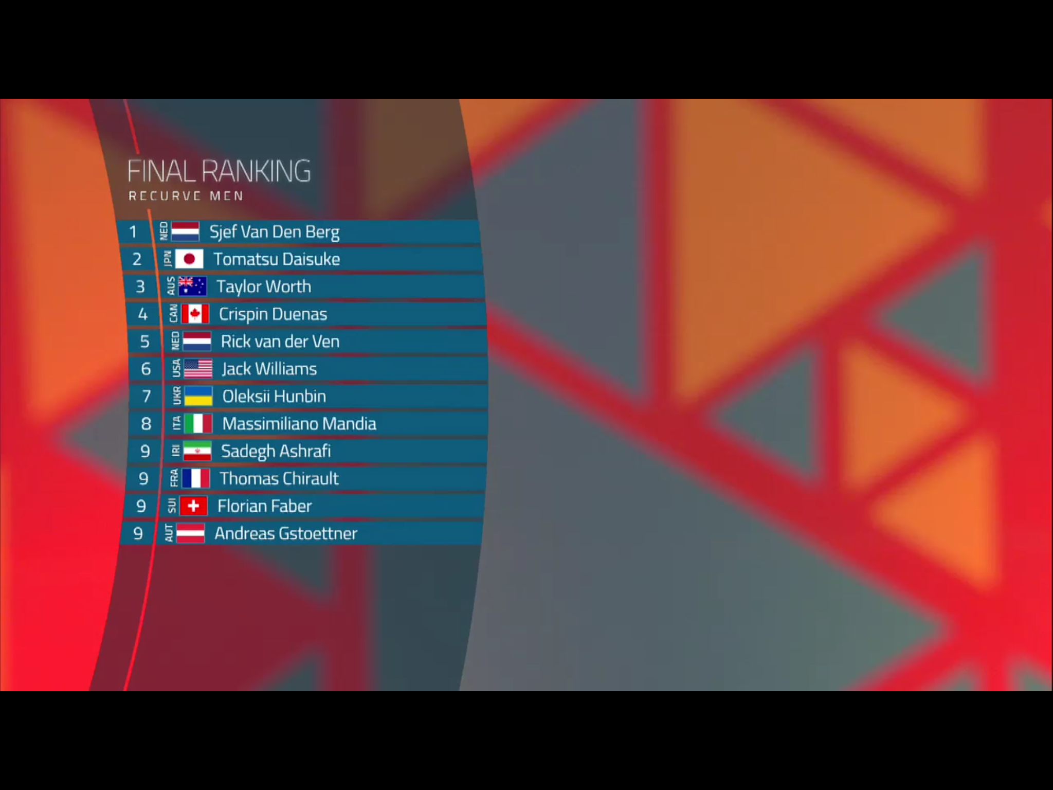 In den Achtfinals schoss Florian Faber gegen den Weltranglisten-Elften Crispin Duenas aus Kanada. Dieser hatte schon in der ersten Runde volle 120 Punkte gebucht und erlaubte sich auch gegen Florian nur eine 9 – eine klare Sache für den favorisierten Kanadier, der erst im Halbfinal am Japaner Tomatsu Daisuke scheiterte.